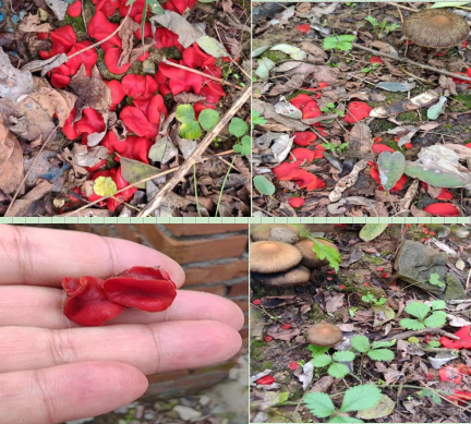 该野生“红木耳”生长于海拔1380米的山坡灌木林下,以当地林下腐殖质土为基质,与周边菌类生长环境一致,呈丛生状态,分布范围近20平方米,共4大块。其通体为鲜艳深红色,胶质饱满、耳片褶皱细密,形似花瓣,质感柔软,在林下绿植中格外醒目,形态与色泽极具辨识度。