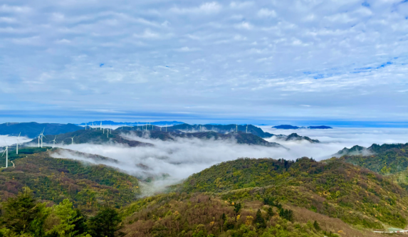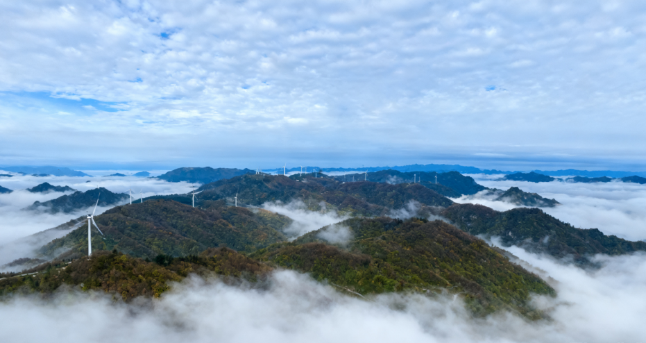 银白色的风力发电机高耸入云,在短暂放晴的蓝天映衬下愈发挺拔。叶片随着山风律动,从头顶呼啸旋转而过,仿佛在搅动漫天云絮,与远处的山峦、翻涌的云海、苍翠的山林相映成趣,构成一幅巨型山水丹青。雨水洗涤后的山林格外鲜亮,枝叶上还挂着晶莹的雨珠,微风拂过,水珠轻颤滴落。秋风恰似打翻了自然的色盘,火红的枫叶、金黄的杂木、翠绿的松柏交织错落,让秋雨后的嘉陵江源头更显梦幻多姿,每一处景致都令人震撼。